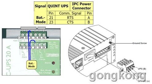 對(duì)于工控機(jī)供電,以前的方案主要是通過(guò)COMBICON電路板插接片連接到工控機(jī)面板上,對(duì)于24V UPS而言,可以使用干結(jié)點(diǎn)輸出的幾個(gè)信號(hào)連接到電路板插接片或者是找到能夠可插拔端口的24V UPS.這種方法通過(guò)COM1或者COM2端口讀取和存儲(chǔ)數(shù)據(jù),來(lái)顯示UPS的狀態(tài)并控制UPS的關(guān)閉。如圖二所示。